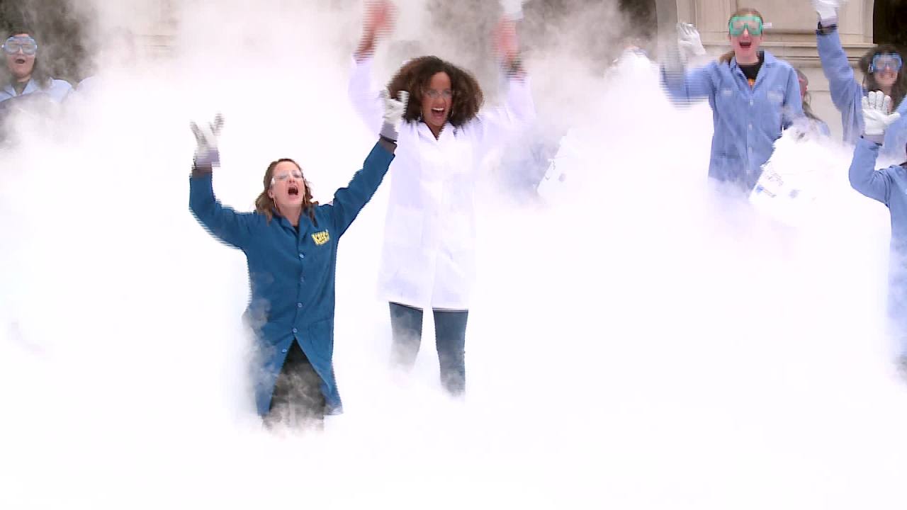 AUSTIN (KXAN) — University of Texas at Austin Chemistry Professor and author Dr. Kate Biberdorf, also known as Kate the Chemist, was joined at UT Tower today by 50 female science students for a large-scale science experiment.