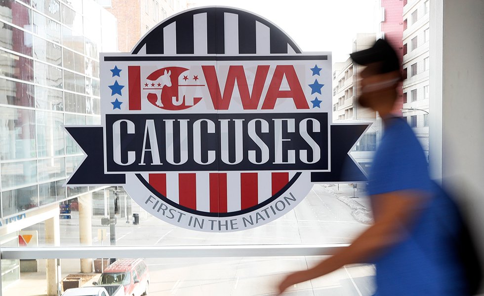 A pedestrian walks past a sign for the Iowa caucuses on downtown skywalk in Des Moines. AP Photo/Charlie Neibergall