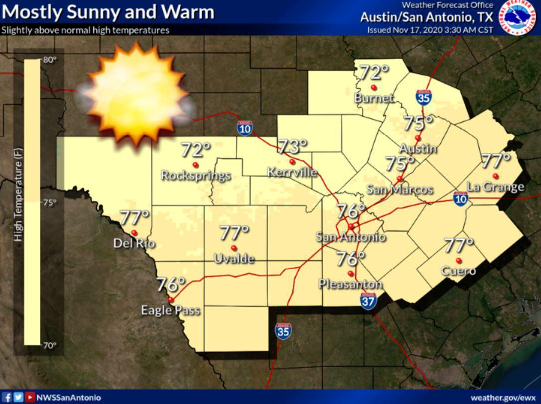 Normally on Nov. 17 in Austin, the high temperature is 71 degrees and the low is 50 degrees, according to the weather service.