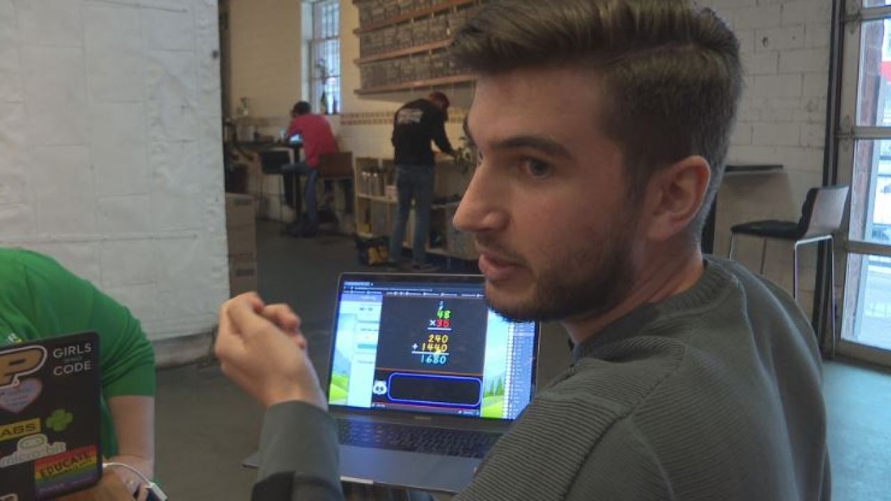 Nathan Lord, founder of the startup MathMoji, presents his product to an informal meetup of people attending AltSXSWedu on Monday, March 9, 2020. (KXAN Photo/Chris Davis)