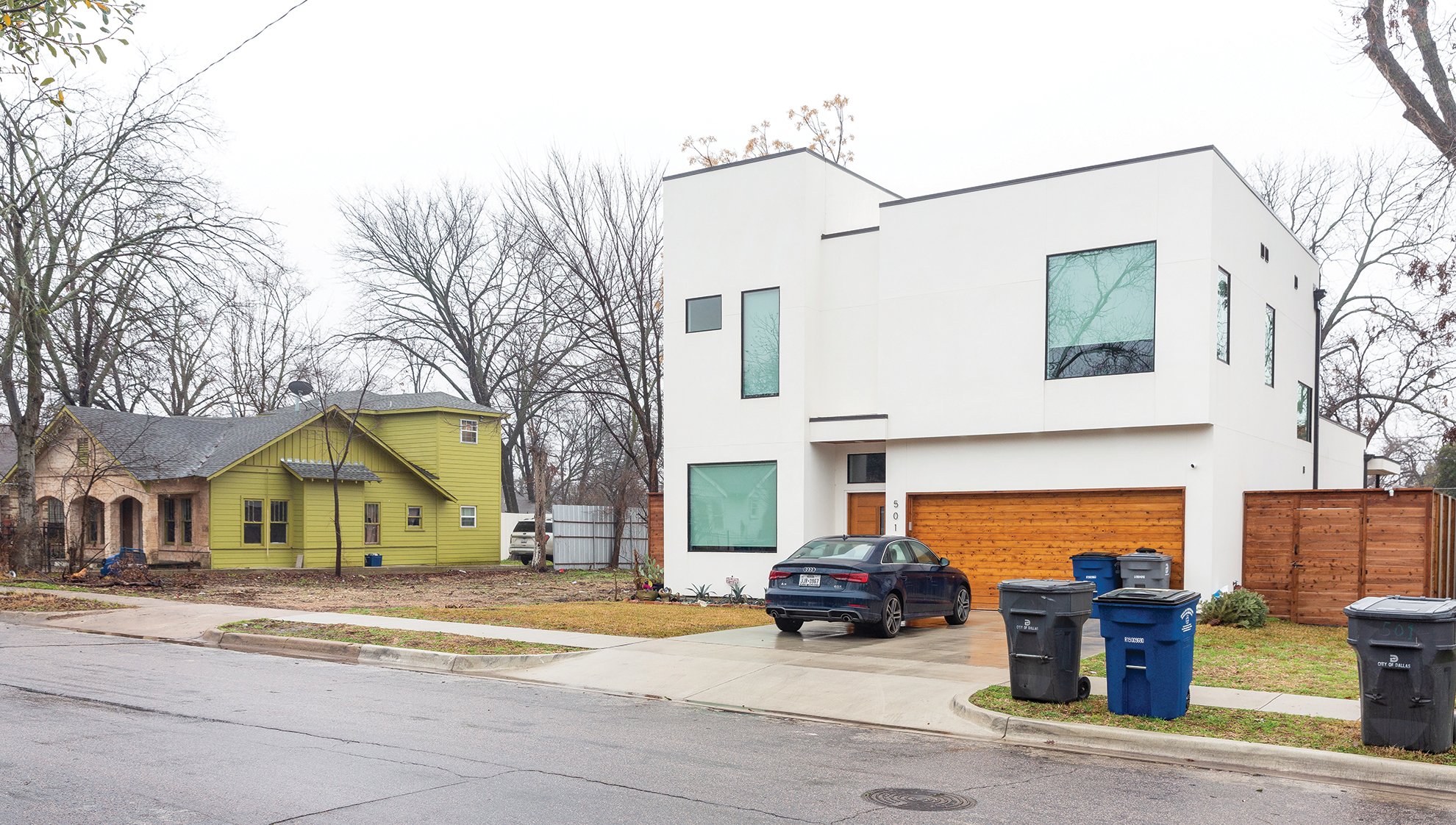 The white elephants—towering over the bungalows and cottages that used to be good enough, obscuring the present and obliterating the past—reveal what Nicanor calls “two very different dynamics and two very different futures.” Maybe the saddest part is how few new Texas houses have porches, one of the features of older residential architecture that served as a gesture of welcome.