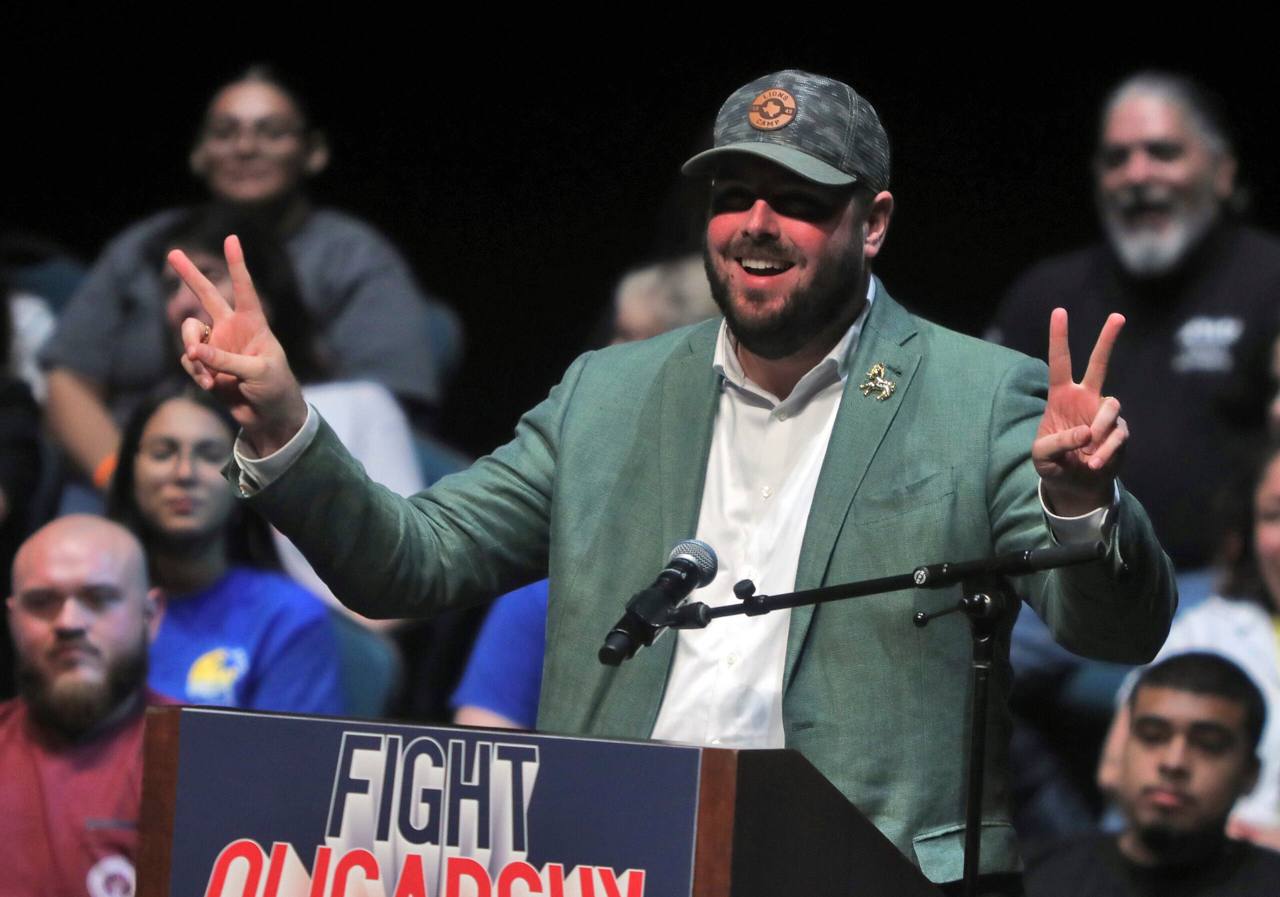 Kendall Scudder steps up to the podium before U.S. Senator Bernie Sanders speaks during a June 2025 stop in McAllen. (Joel Martinez/The Monitor via AP)