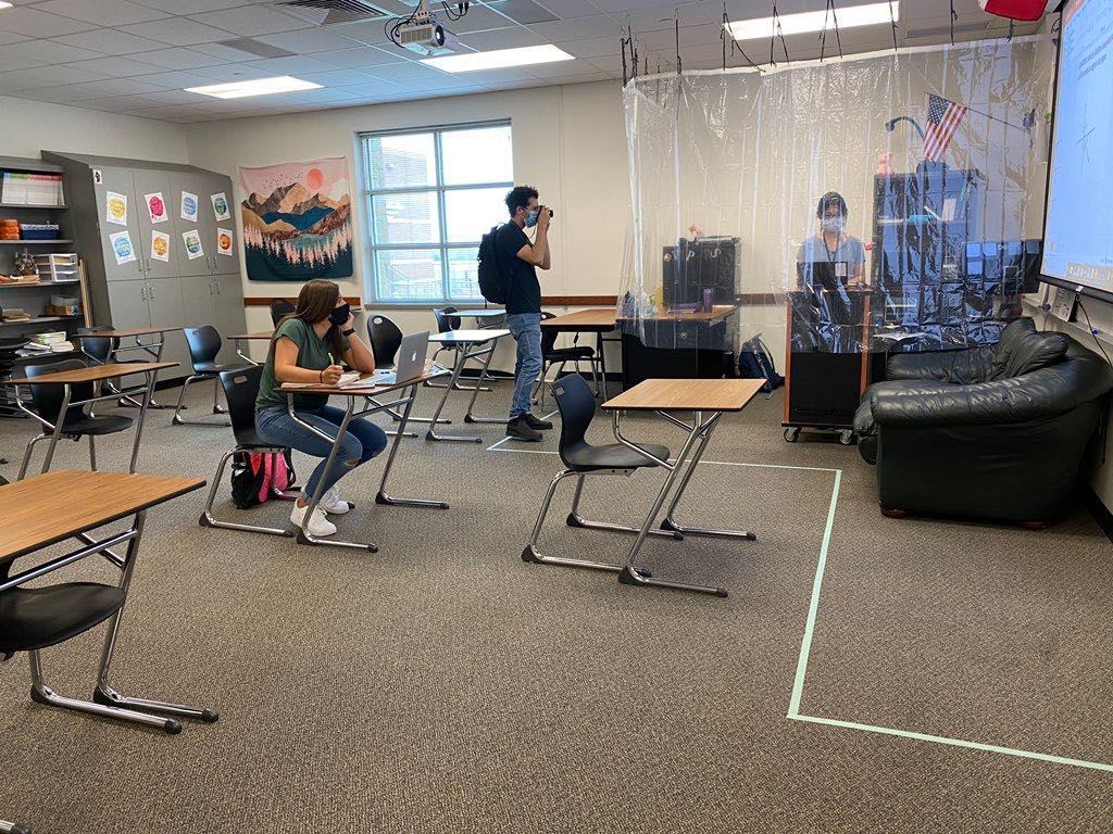 At the elementary level, story time looks drastically different. Leander ISD sent KXAN the photos below. You’ll find students in pods, wearing a mask and listening to their teacher’s story from a distance. In high school, students are virtually learning from their desks while their teachers sit in the corner guarded by a plastic shield.