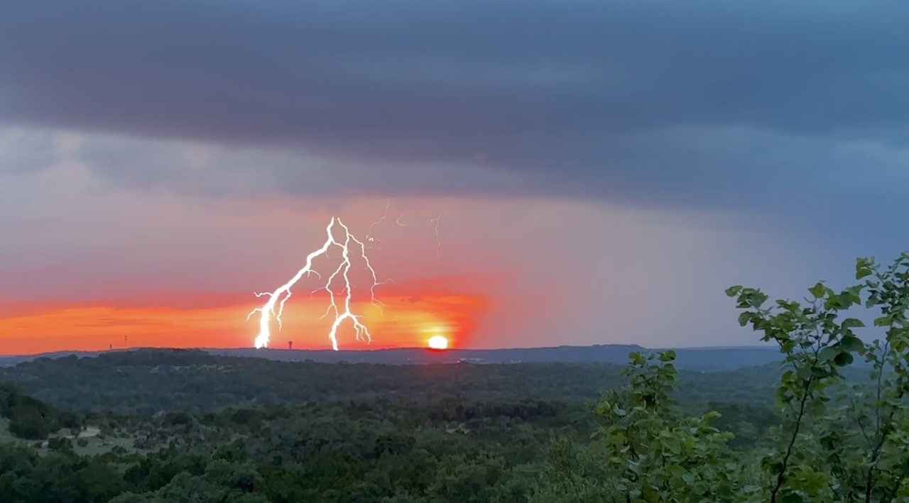 9 p.m.: Viewer Crystal Faris took this wonderful shot of lightning striking as the sun sets behind it from outside Dripping Springs.