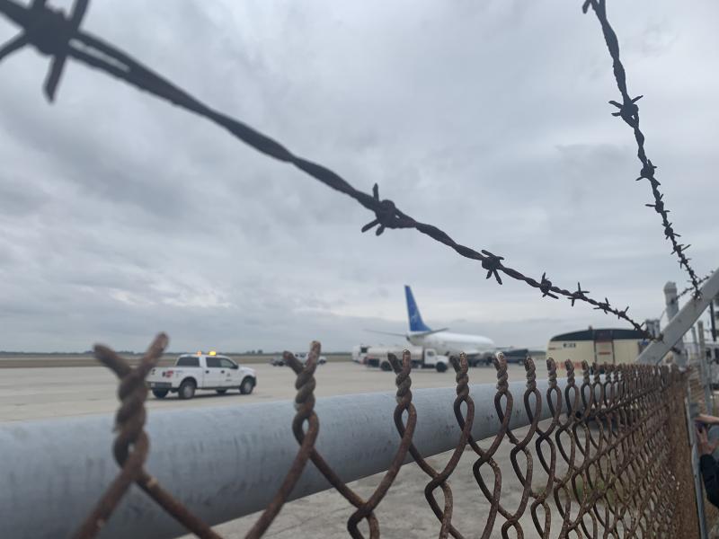 Thomas Cartwright ran along a chain link fence outside the runway at the Brownsville South Padre International Airport. He was trying to catch a glimpse of buses loading migrants onto a plane.