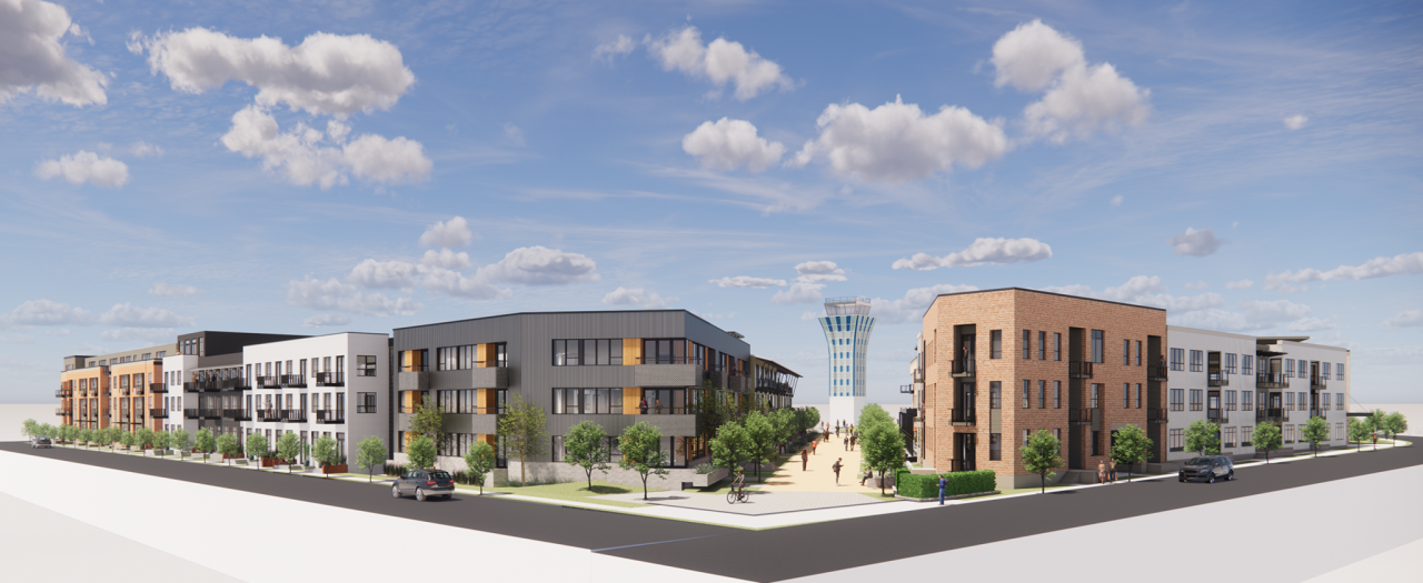 The project will also include two mid-rise buildings of three- to five-stories. A tree-lined public path between buildings will connect the control tower and a plaza to John Gaines Park.