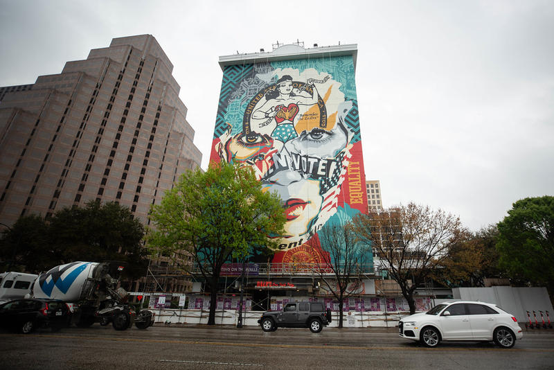 The public artwork celebrates the 100th anniversary of the 19th amendment, which granted women the right to vote. Canadian artist Sandra Chevrier was chosen to collaborate with American street artist Shepard Fairey to paint on the west side of the LINE Hotel.