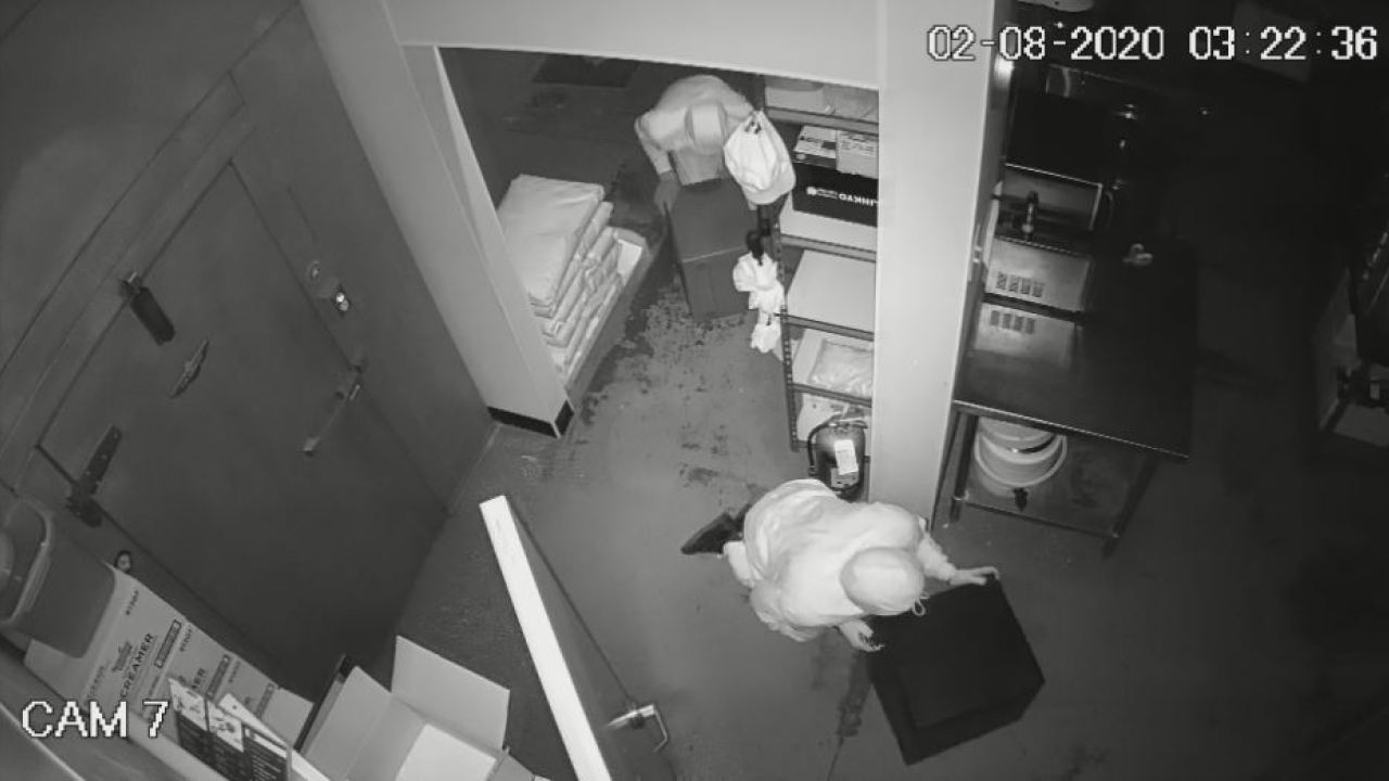 In the two Teapioca break-ins, three people in those same sweatshirts and gloves push locked safes, filled with cash, across the floor.