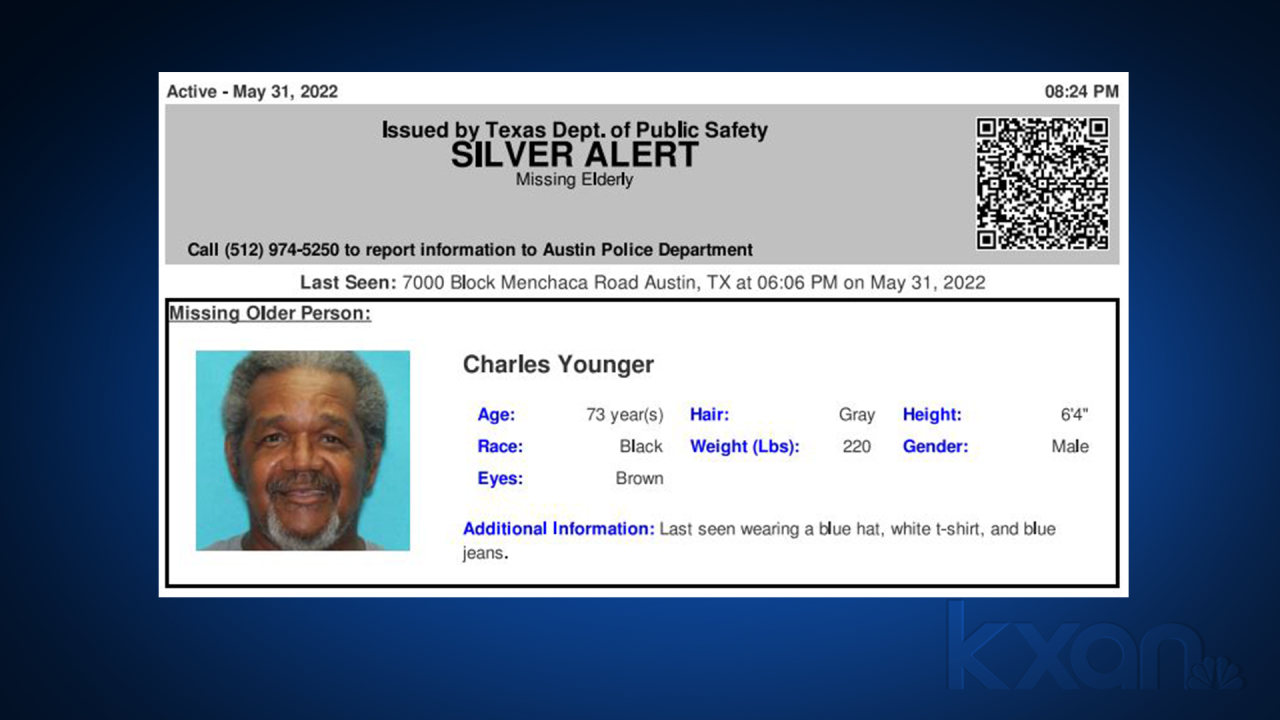 On behalf of the Austin Police Department, the Texas Department of Public Safety issued the alert for 73-year-old Charles Younger, who was last seen shortly after 6 p.m. in the 7000 block of Menchaca Road.