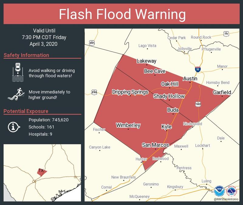 Southern Travis County and all of Hays County remain under a flash flood warning until 7:30 p.m. as a line of storms moves out of the Austin area.