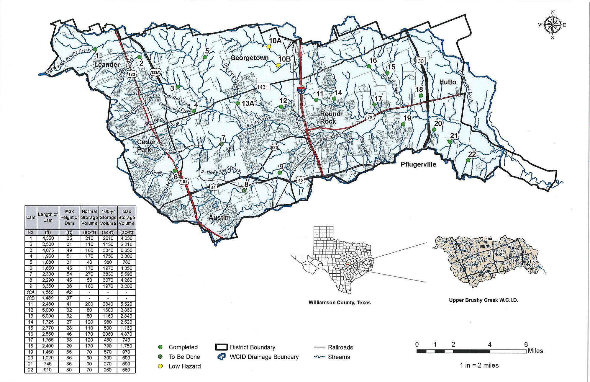 Formed in 2002, the Upper Brushy Creek Water Control Improvement District is responsible for the operation and maintenance of flood control structures within the Upper Brushy Creek watershed in the Brazos River Basin, said Mike Freeman, president of the the district’s board of directors. The district oversees 23 dams in southern Williamson County, with most located in and around Round Rock, Leander, Cedar Park and Hutto.
