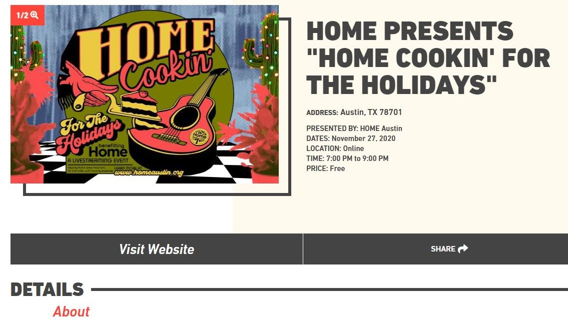 The “HOME COOKIN’ FOR THE HOLIDAYS” special, a virtual benefit and fundraiser, combines two of Austin’s staples—lively music and great food.